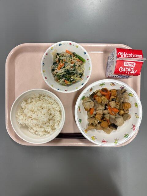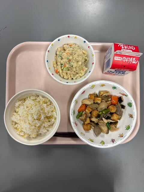 椎葉の椎茸を使った椎葉煮しめが出ました。少し大きめにカットされた椎茸や里芋、たけのこ、ごぼうなどにしっかりと味がついていておいしかったです。ミルクおからは、人気のメニューでもありますが、1年生は初めて食べたようでした。今日もおいしい給食をありがとうございました。