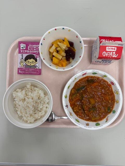 今日はハロウィンメニューでかぼちゃのミートソースにが出ました。ミートソースとかぼちゃがよく合っていておいしかったです。また、ぶどうゼリーも味が濃厚で子供たちに好評でした。