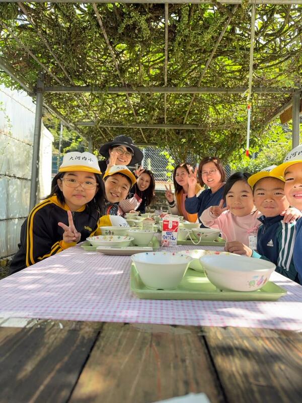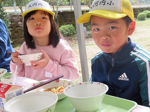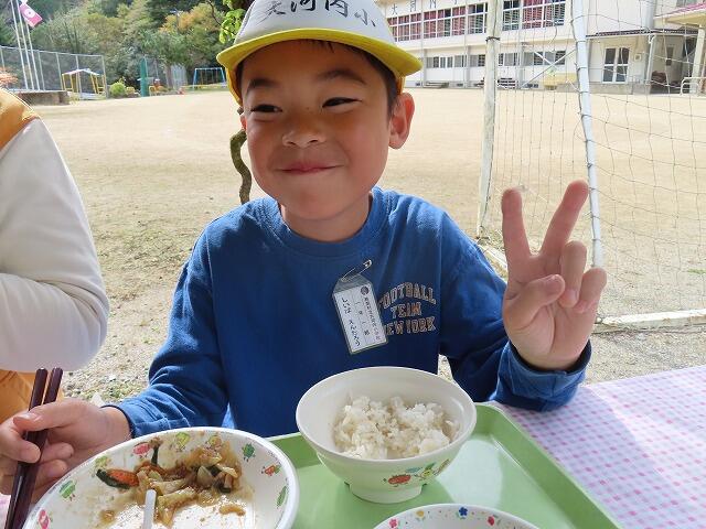 今日は中華のメニューの回鍋肉が出ました。5.6年生が陸上大会だったため、1.4年生と一緒に校庭にあるせせらぎ広場で給食を食べてピクニック気分でした。