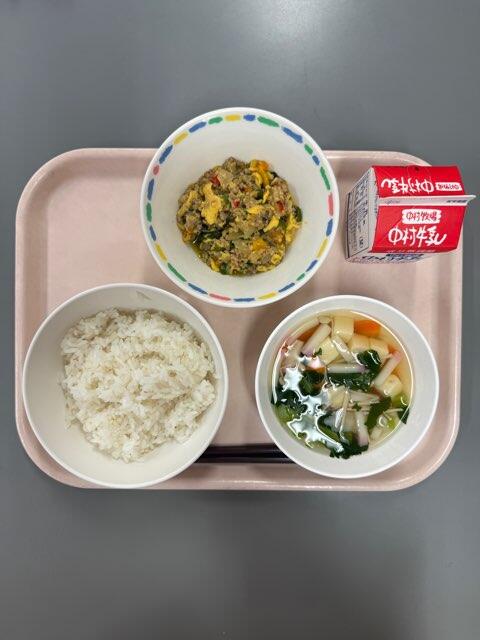 11月始めの給食は、カラフル肉みそ丼でした。野菜が沢山入った具材に肉味噌が絡んでとっても美味しかったです。