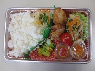 麦ごはん ・ 鶏のから揚げ ・ 添えきゅうり ・ 県産野菜の五目スープ