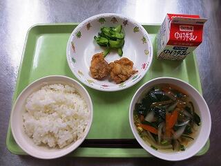 麦ごはん ・ 鶏のから揚げ ・ 枝豆 ・ 白菜のみそ汁