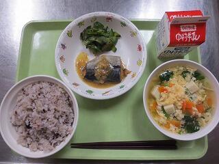 雑穀ごはん ・ かき玉汁 ・ さばゆずみそ煮 ・ ゆかりあえ