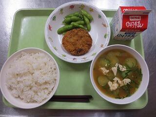 麦ごはん ・ 夏野菜のみそ汁 ・ 鶏のから揚げ ・ 枝豆