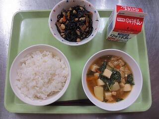 麦ごはん ・ じゃがいものみそ汁 ・ 大豆とひじきの炒め煮