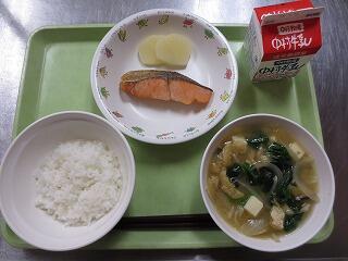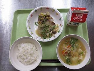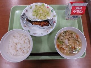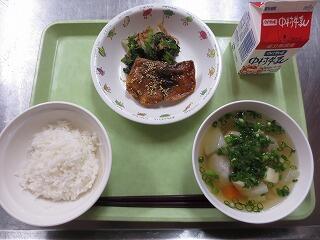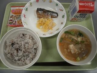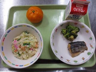 今日は、学校給食記念日ということで、初めての給食の献立「おにぎり、焼き魚、つけもの」と似たような給食です。今週は、本校でも給食感謝週間を設定して交流給食等を予定しています。