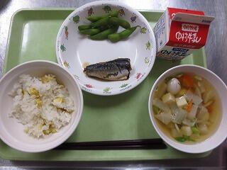 麦ご飯 ・ かきたま汁 ・ さばのホイル焼き ・ ゆかりあえ