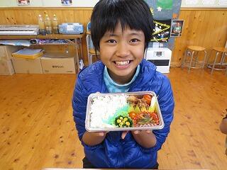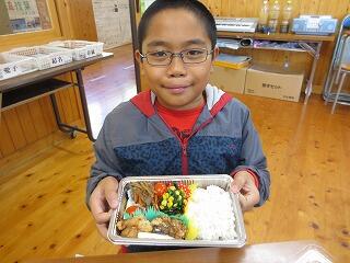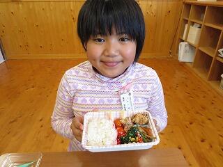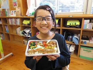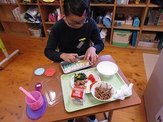 子どもたちには、学年にあった大きさの弁当箱とバラン、カップを配り、給食を弁当箱に詰めていきます。