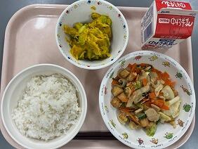 海藻サラダは、ごま油の風味が食欲をそそりました。コーンの黄色が鮮やかで、見た目にも楽しめました。かぼちゃのミートソース煮は、とろみがついていて食べやすく工夫してありました。ウスターソースやトマトソースの味がしっかりしていて、おいしかったです。ふりかけがあると、いつもよりご飯を食べるのが早い子どもたちでした。