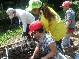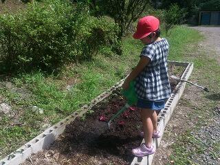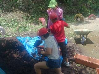 ところで、前回の8月23日の登校日に、畑の除草をしたのですが、その後の台風の影響で、オクラが倒れてしまっていました。そこで、土を入れ、それを戻す作業を行いました。