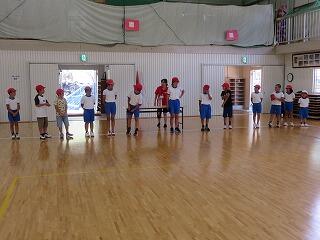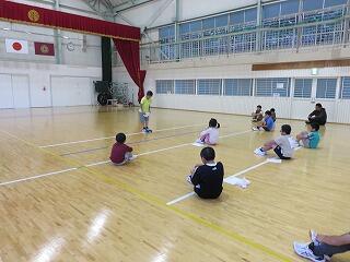 体育館で全校で体育をしていました。交代で背中をかして準備運動。