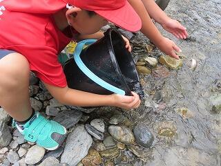 安全に気を付けながら川原に降りて、バケツリレーで稚魚を運びます。