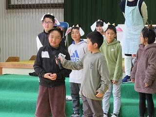 「椎葉村学」で練習してきた方言を使った劇を披露しました。「今日の晩飯は鹿かい。うめえごたっが!」。お客さんたちも大笑い。