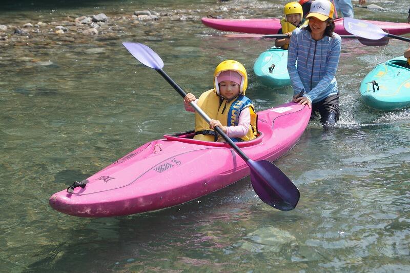 色とりどりのカヤックが子どもたちを待っていました。グループごとに交代しながらカヤックの体験と水遊びをしました。
