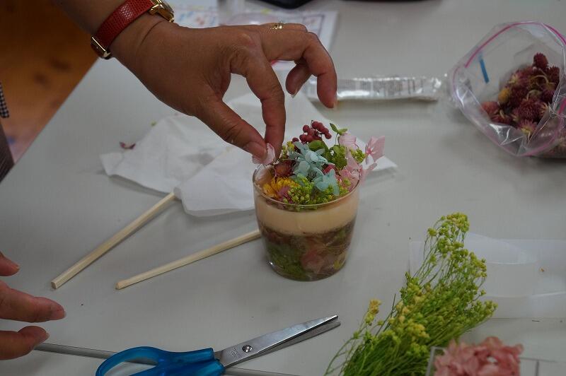今回は、門川町からアロマセラピストの講師を招いて、香りと心や体の関係についてお話をしていただいた後に、アロマジェルキャンドルやアロマワックスバーなどの作品を作りました。