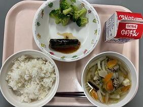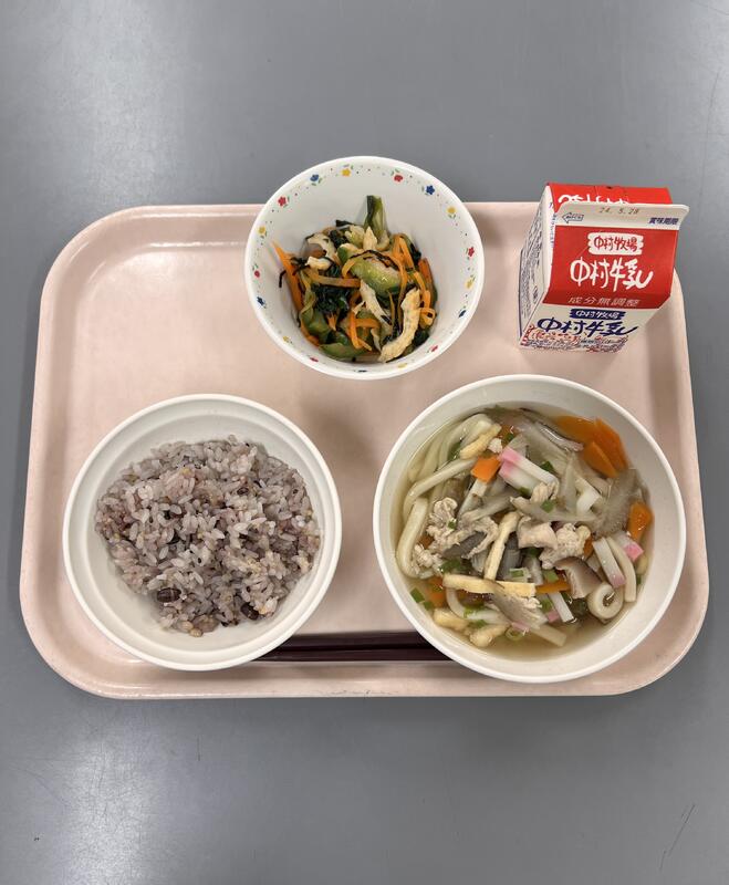 十六穀ごはんは雑穀の食感がよく、プチプチしていて楽しみながら食べられました。きんぴらは、レンコンやごぼうがたっぷり入っていて、食物繊維が豊富に取れました。肉うどんは、1年生と5年生のリクエスト献立です。肉のうま味がスープと野菜に染みていて、うどんもコシがあっておいしかったです。大満足の献立でした。