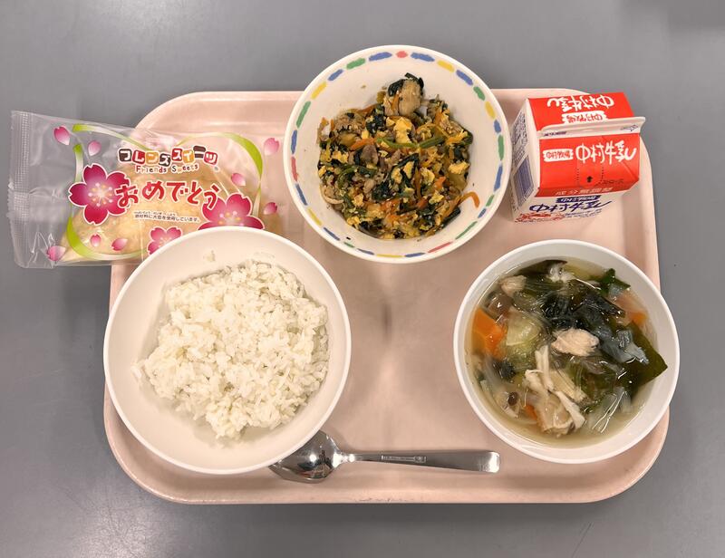 今日は、令和5年度最後の給食でした。さんましょうが煮は柔らかく、身がほろほろしていてごはんとよく合いました。しょうがの風味も良く、食欲をそそりました。沢煮椀は豚肉が入っていて、脂が出ていてコクがあり、おいしかったです。1年間、最高の給食をありがとうございました。