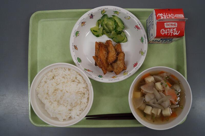 麦ごはん けんちん汁 しいらの甘辛揚げ 添えキュウリ