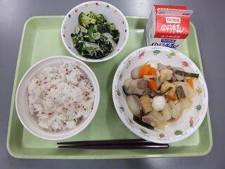 麦ごはん だご汁 いわしおかか煮 添えキャベツ