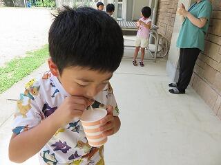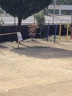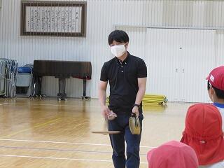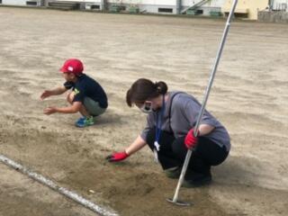 今回もおそろいの帽子をかぶって、先生と子どもたちが運動場で学習をしていました。