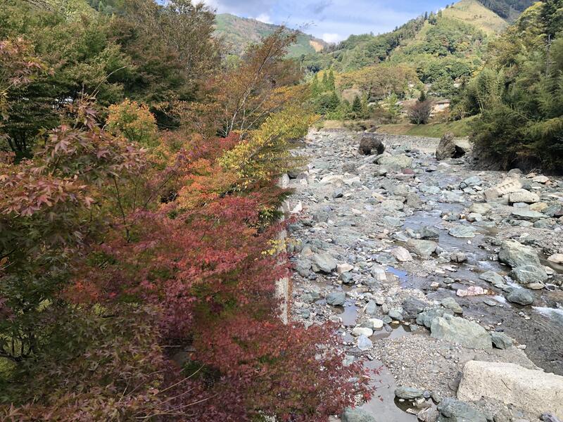 学校前の橋から見えるモミジもいよいよ色づいてきました。