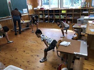 まずは念入りに準備運動。写真の通り、大河内小のプールはビニルハウスなので、準備運動で汗ばんできます。とても暖かいです。