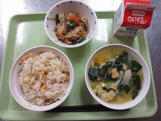 わかめごはん ・ 炒り豆腐 ・ ほうれん草のごまあえ