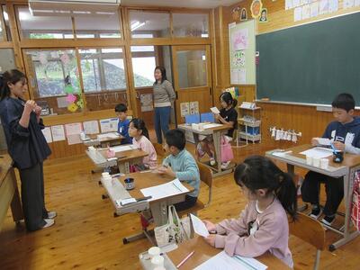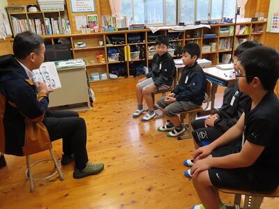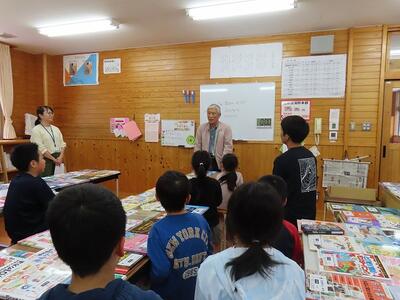 1・4年生は、集落支援員のMさんにご来校していただき、読み聞かせをしていただきました。