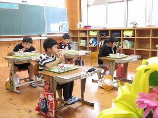 大河内小では、全校13人全員で協力して給食の準備をします。食中毒を起こさないように、一人一人ができることをしっかりと考えていました。