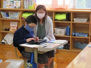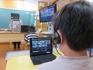 インターネットを使って松尾小との合同学習を行いました。今回は、大河内小の1・2年生の先生が授業を進めます。