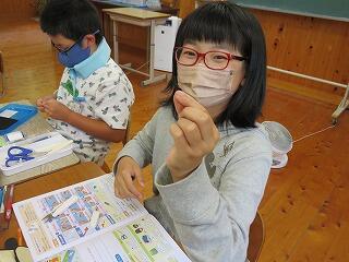 はじめに、サイコロの出た目に応じたお題で自己紹介をしました。みんなハキハキと自己紹介しました。松尾小の子も大河内小の子もすばらしい!ですので、お互いに拍手。