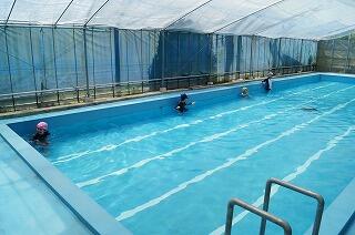 プールでは恒例のペットボトルのお湯による修行です。
