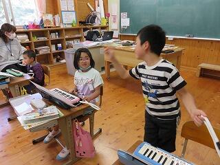 1・2年教室からは鍵盤ハーモニカの音。何やら難しい表情ですが…