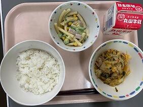 2学期最初の給食です。グリーンサラダは塩コショウが効いていて、さっぱりと食べられました。鶏肉のうま煮は、鶏肉と野菜のうま味が具材によく染みていて、ご飯に合います。「やっぱり給食はおいしいね~」と言いながら、笑顔で完食した子どもたちでした。
