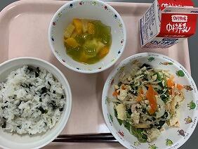 わかめごはんは塩気が効いていて、おいしかったです。おにぎりにして食べたい味でした。ゴーヤチャンプルーは、ゴーヤの苦みが出ないように薄くスライスしたり、工夫した味付けをしてあったり、調理員さんの工夫のおかげで子どもたちもおいしそうに食べていました。豆腐のふわふわともやしなどのシャキシャキがよく合います。フルーツ和えは、冷たくて甘くて夏にピッタリでした。