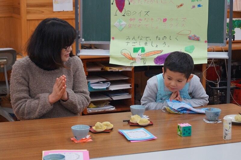 茶巾しぼりを作ることも楽しみなようでしたが、自分たちで育てたお芋の味も楽しみにしていたようです。できあがった茶巾しぼりは保護者とお茶会をしていただきました。