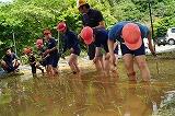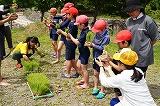 これまでに下準備として、田おこしや代かきを保護者がしてくれていました。今日は、保護者からいただいた稲の苗をみんなで植えました。1年生のYくんは学校では初めてですが、2年生以上は1年ぶり。さあ要領を覚えているでしょうか。
