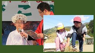 大河内小から代表として6年生の2人が発表しました。壇上でやや緊張の面持ちの2人ですが…。