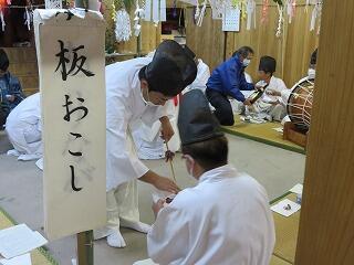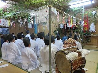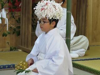 いよいよ子ども神楽の出番です。まずは3・4年生を中心とした子どもたち。今回がデビューの舞台の子もいます。お客さんもたくさんいて、みんなやや緊張の面持ちです。