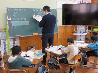 3・4年生、社会科の授業。3年生が先生と一緒にお勉強している間は、