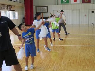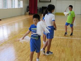 はじめに踊りの確認です。太鼓のバチをもって踊ります。教えてくださる地域の先生も子どもも一所懸命です。