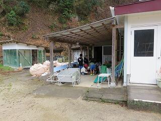 写真ではそう見えませんが、雨が降っていました。ですので、体育館裏の軒下で作業をしています。