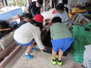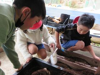 昼休み後の「ボランティアタイム」の時間。花を育てるための土づくりです。