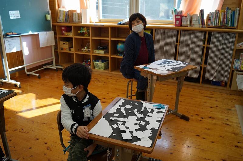 低学年は図工の授業でした。はさみを自由に使い、切り取った形を組み合わせて作品を作っていました。今回は、おじいちゃんも参観してくれました。