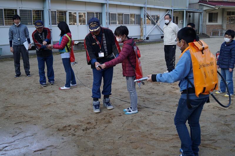 午後からは、火災の避難訓練を行いました。消防団のお兄さんに来ていただき、火災についての説明や消火方法の指導を受けました。