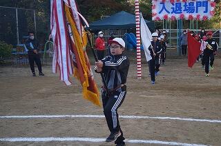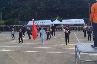 入場行進。保育所の子どもも一緒に、りりしい姿を見せてくれました。