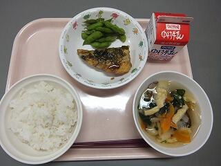 麦ごはん 白玉団子汁 魚のピリ辛揚げ 枝豆