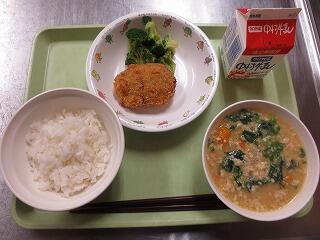 麦ご飯 ・ ひむかスープ ・ ビーフ肉じゃがコロッケ ・ 添えブロッコリー