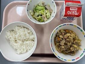 今日の牛丼は、椎葉村からいただいた宮崎牛を使用しています。毎回、子どもたちは「宮崎牛だ~!!」と大喜びです。牛丼の甘辛い味と、宮崎牛のコク、卵のまろやかさがよく合っていて、ごちそう気分でした。花野菜サラダは、ブロッコリーとカリフラワーが華やかで、さっぱりした味付けでおいしくいただきました。