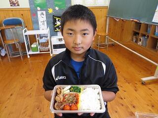 子どもたちには、学年にあった大きさの弁当箱とバラン、カップを配り、給食を弁当箱に詰めていきます。